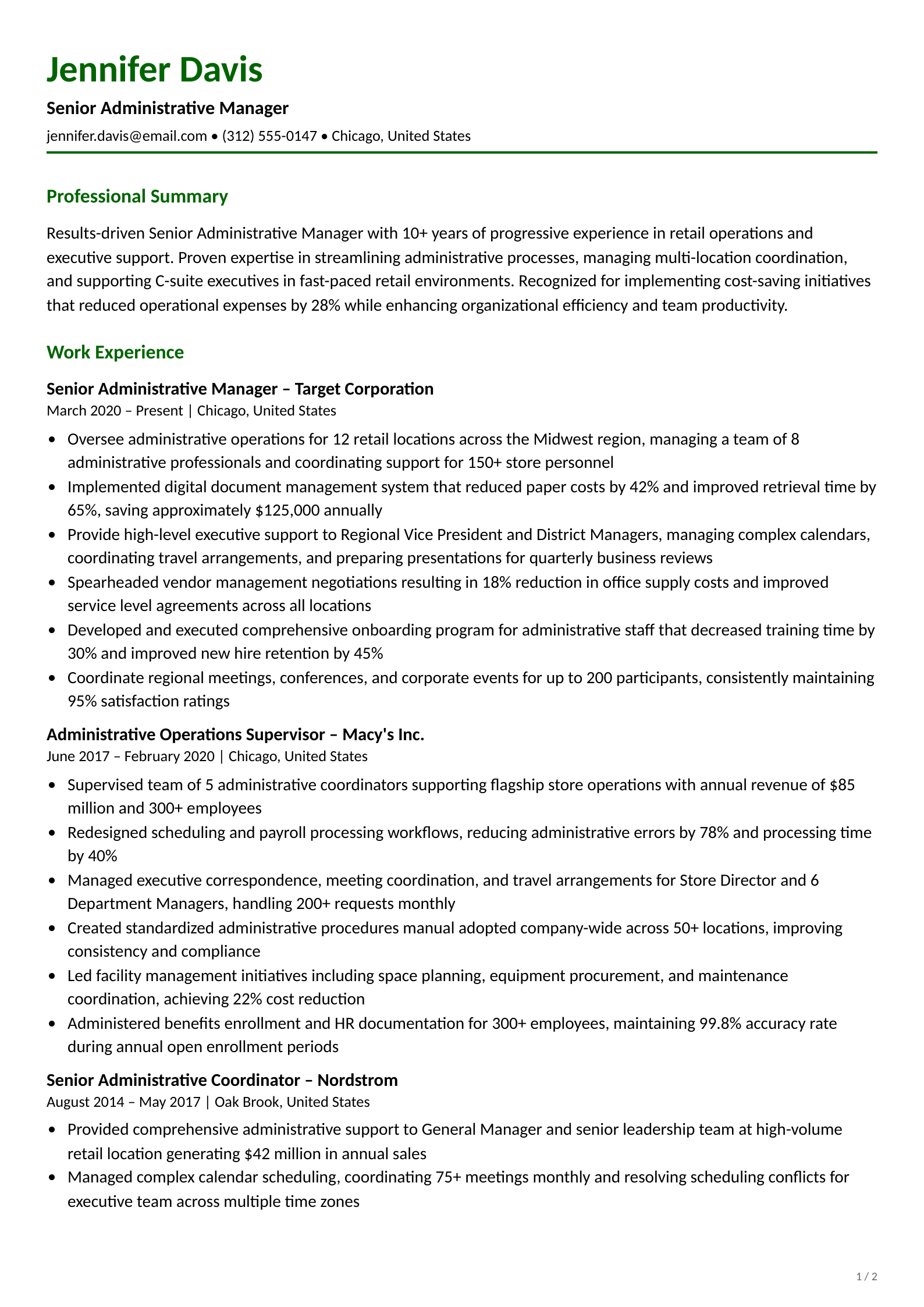 Professional senior Administrative resume template for the Retail industry. Download this ATS-optimized resume example to land your dream job.
