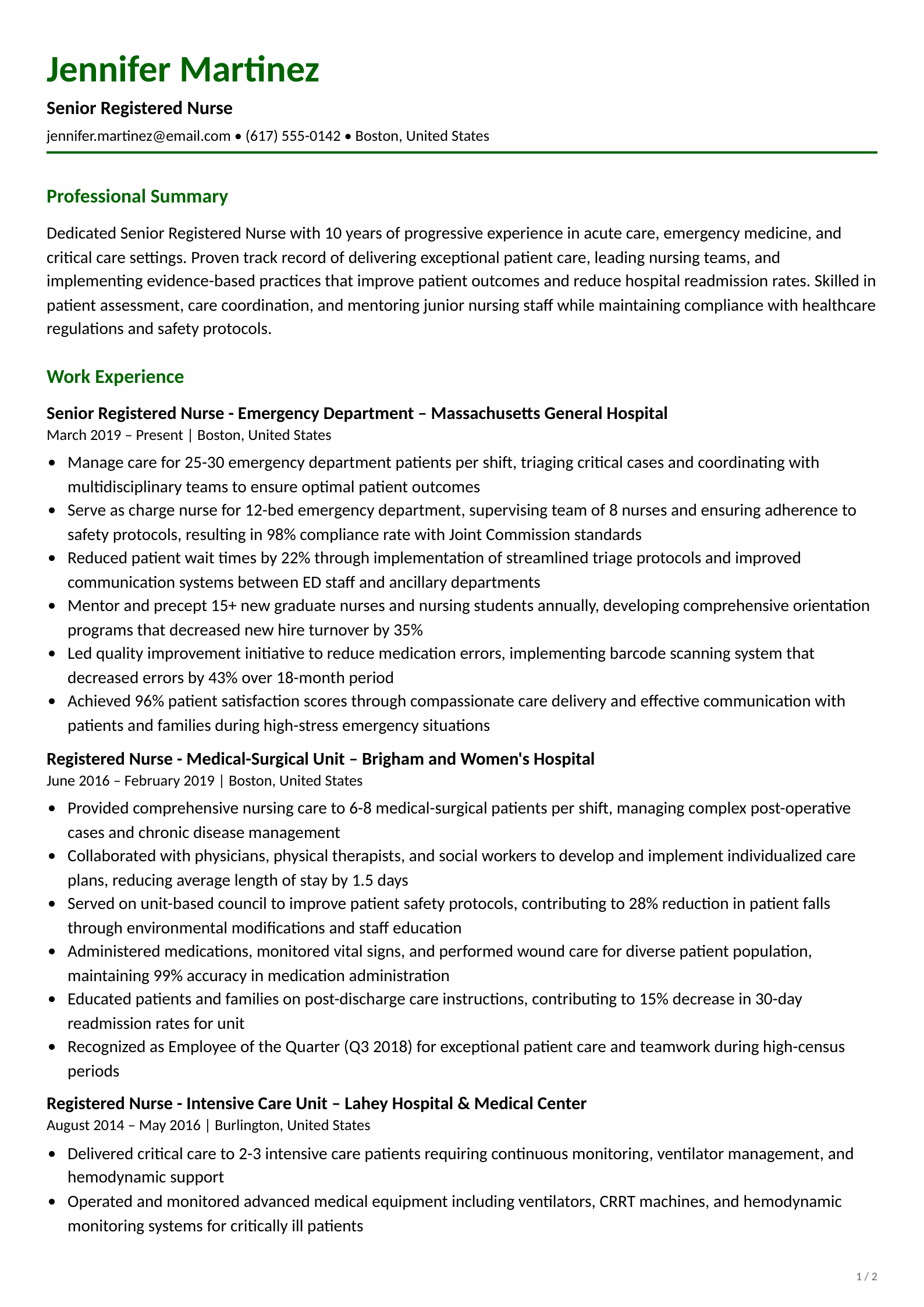 Professional senior Nurse resume template for the Healthcare industry. Download this ATS-optimized resume example to land your dream job.