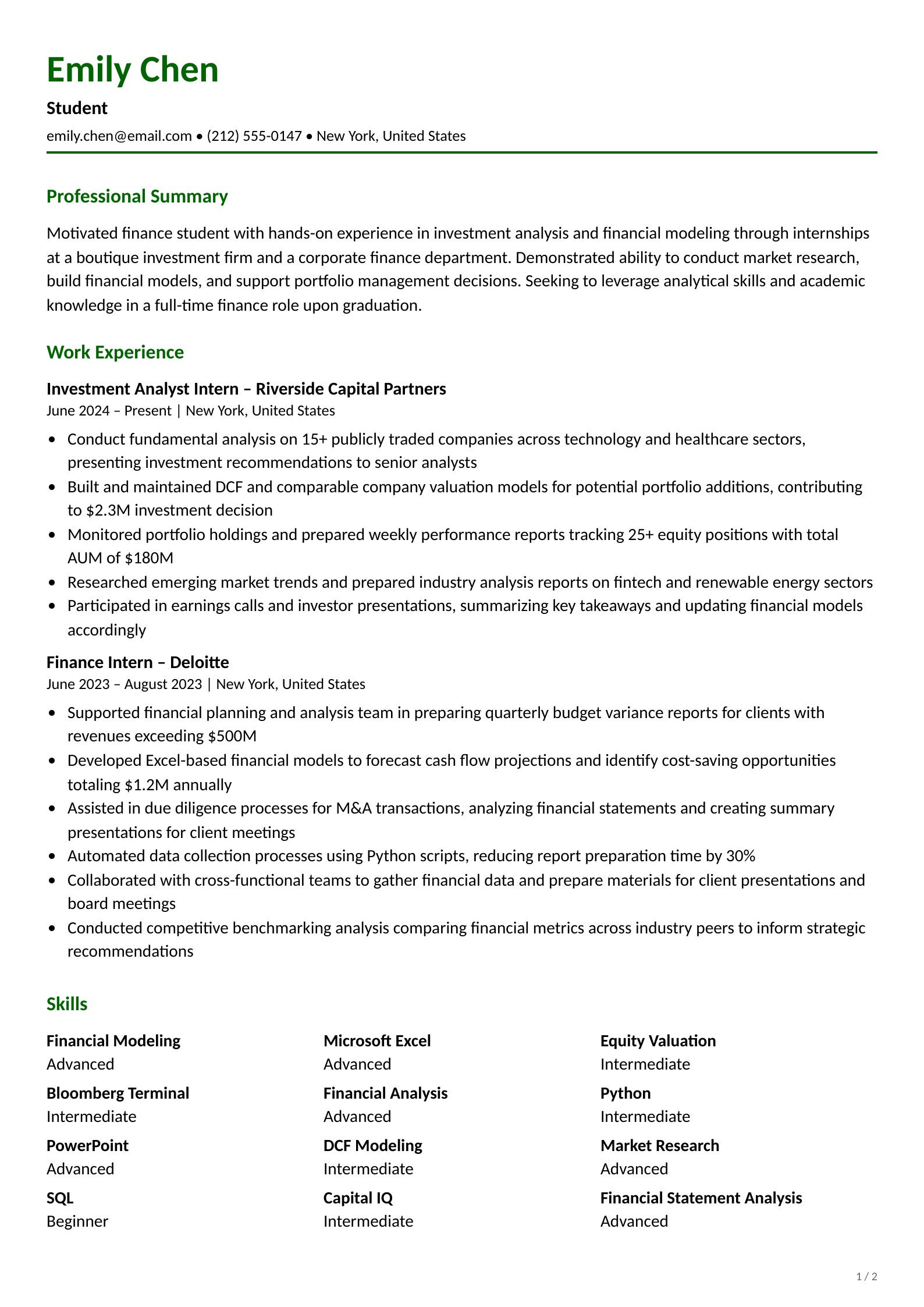 Professional entry-level Student resume template for the Finance industry. Download this ATS-optimized resume example to land your dream job.